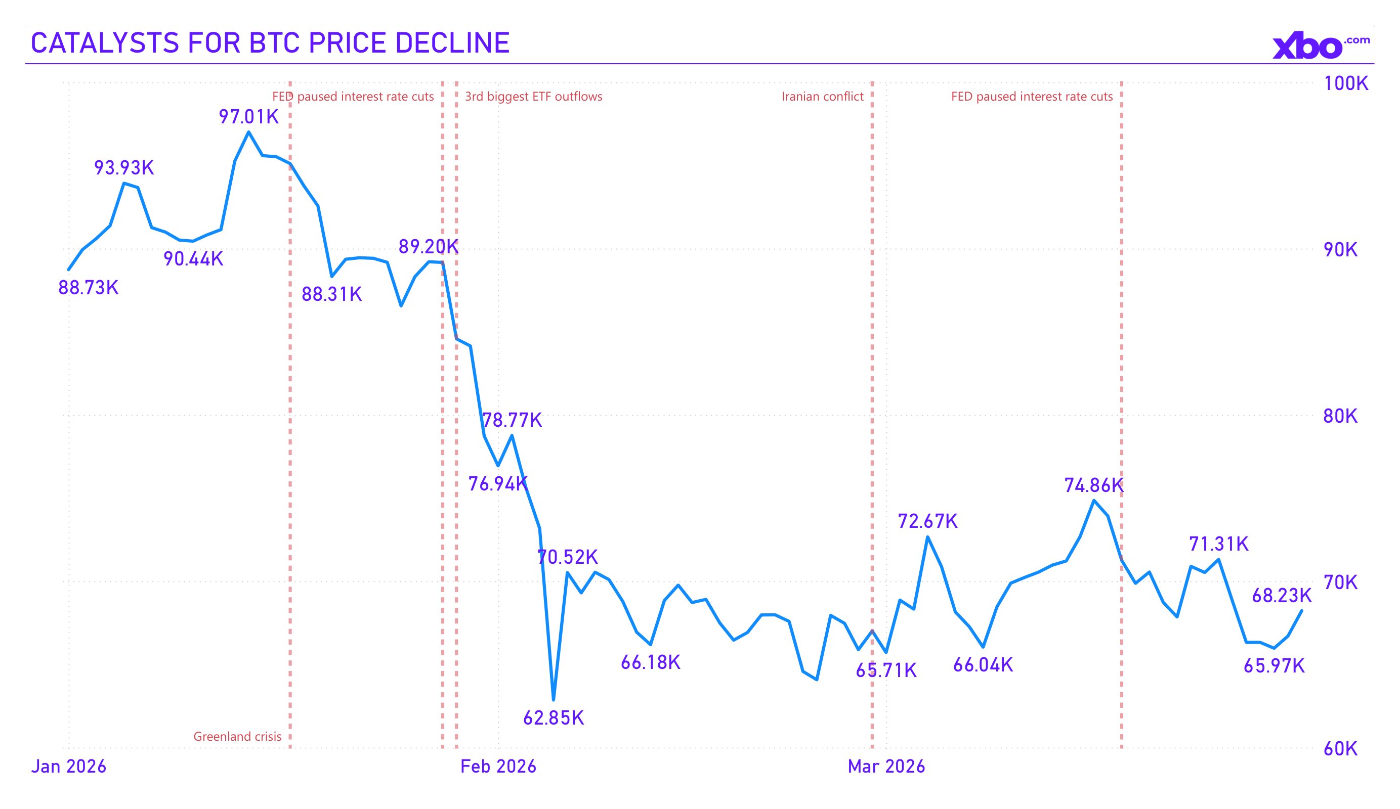 The main event of February (and arguably the entire quarter) was the outbreak of hostilities in the Middle East. On February 28, the United States and Israel launched a joint military operation against Iran. Traditional exchanges were closed for the weekend, and cryptocurrency became the only liquid market for investor reaction. Bitcoin plummeted from $74,000 to the $63,000–$66,000 zone within days. The closure of the Strait of Hormuz drove oil prices above $85 per barrel, and the Fear & Greed Index collapsed to a record low of 5, below the levels seen during the Terra crash and the FTX collapse. Total liquidations on the crypto market over a single weekend amounted to approximately $19 billion. By the end of February, BTC had lost 15% for the month, mirroring the February 2025 scenario, when the decline exceeded 17%.