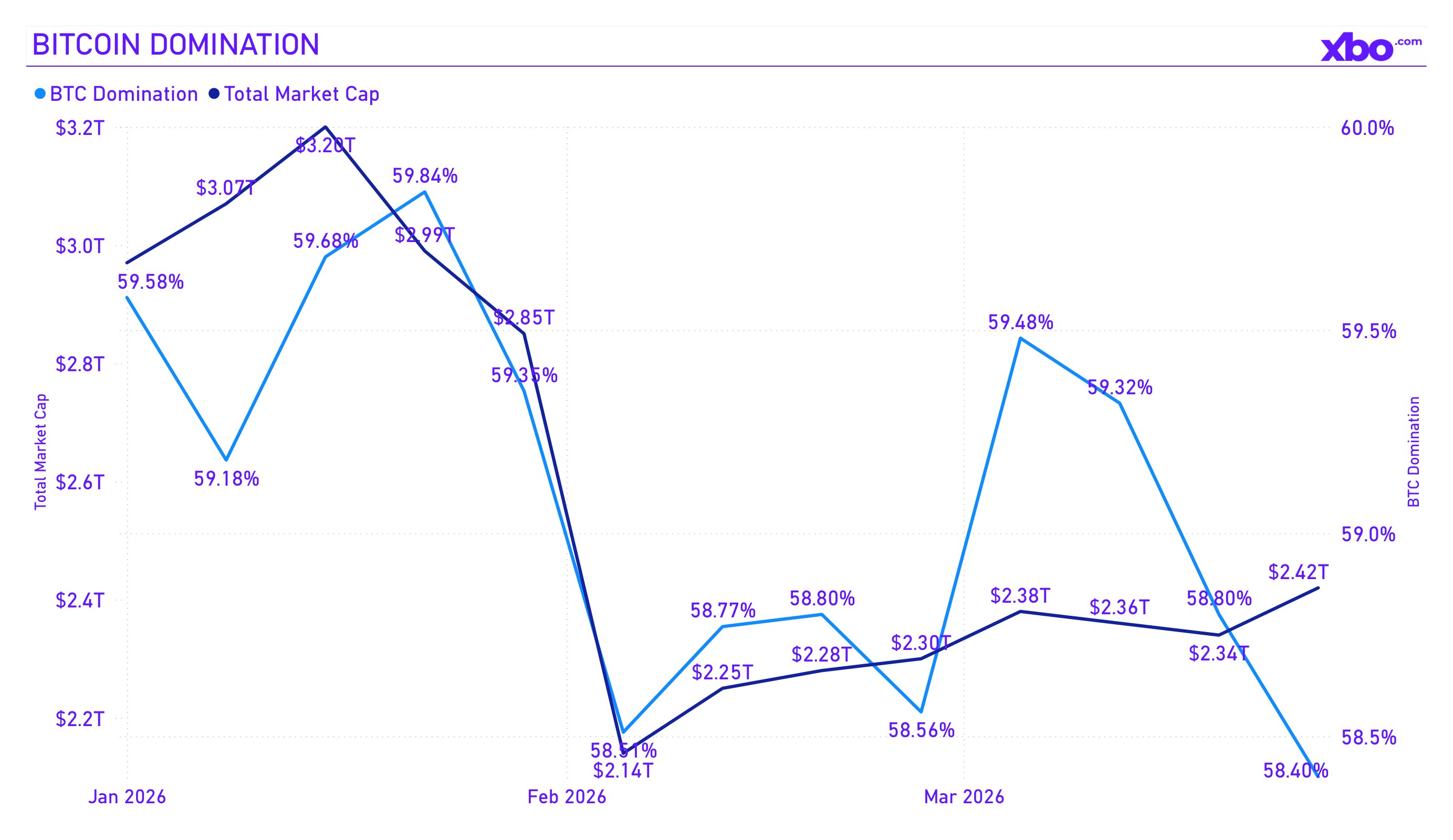 The broader altcoin market suffered more than BTC and ETH. Solana was trading around $83 by the end of March. Dogecoin lost over 50%, XRP fell from $2.40 at the start of the year to $1.35 in March. Bitcoin dominance stood at 58%, reflecting the classic risk-off pattern: capital flows from riskier alts into the "relatively safe" BTC.