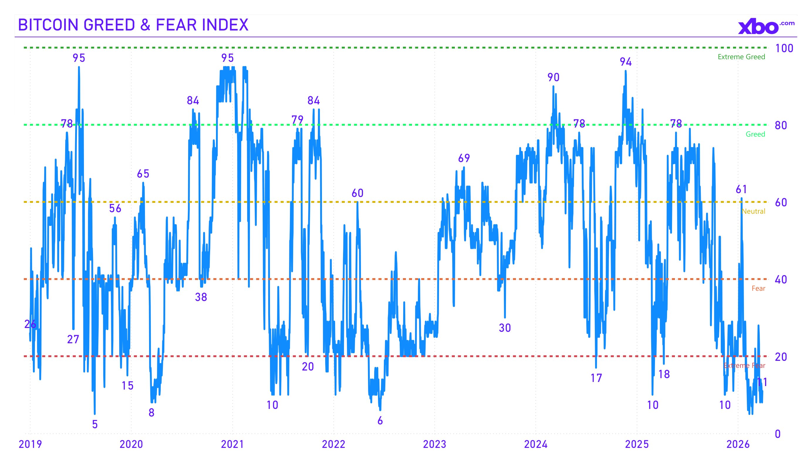 Perhaps the most accurate indicator of market conditions in Q1 2026 was the Crypto Fear & Greed Index. On February 6, the index dropped to an all-time low of 5. This was below the COVID crash of March 2020, the Terra collapse, and the FTX bankruptcy. By the end of March, the index had spent 46 consecutive days in the "extreme fear" zone, which became the longest unbroken streak since late 2022. At quarter's end, the index stood at 11 points, showing no sustained recovery.