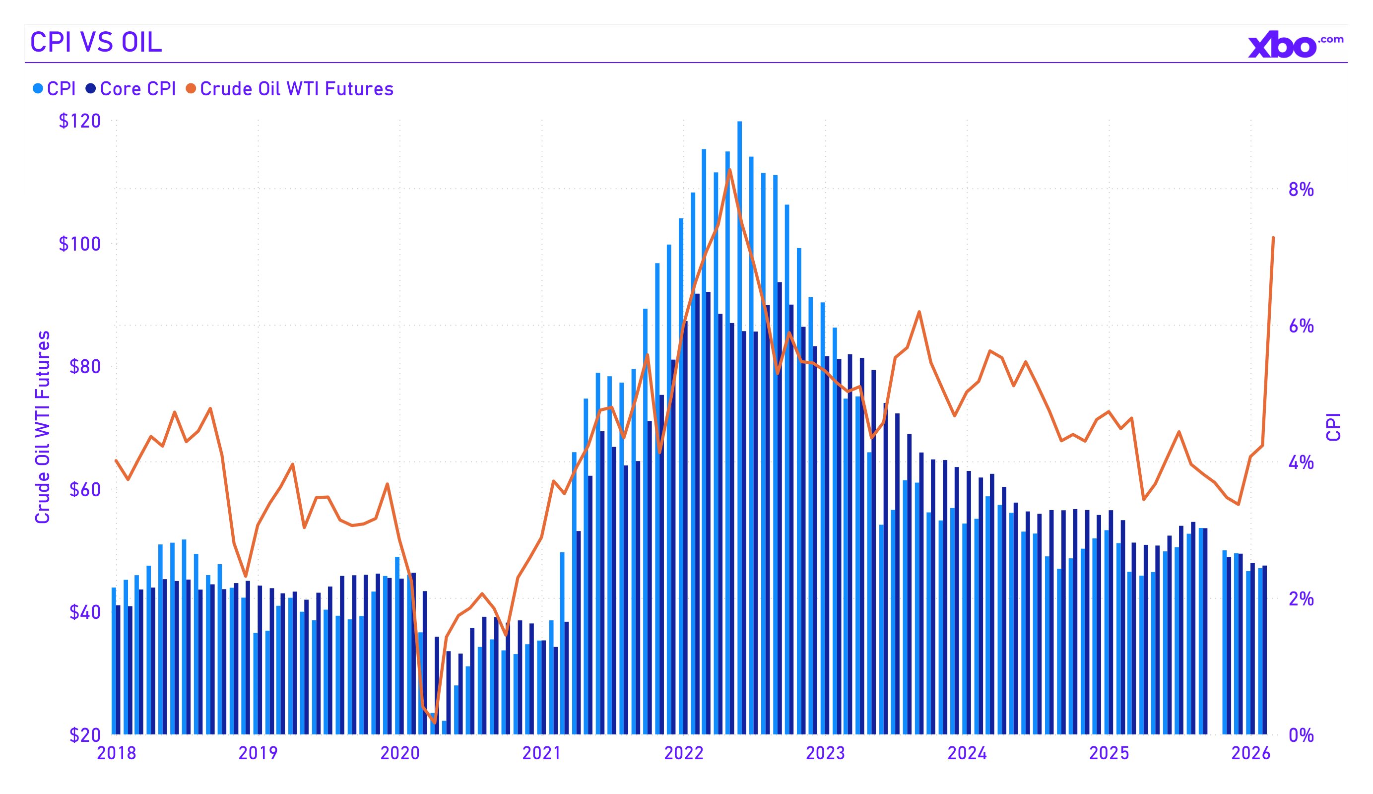 The arguments in favor of this scenario are substantial. According to Capital Economics estimates, even with a relatively quick resolution of the conflict, if the average oil price in 2026 is $100 per barrel, US CPI will rise to 3.5% by year's end. RBC Economics warns that with WTI above $75, headline inflation will exceed 3% as early as Q2, and at $100 it will remain above 3% for the entire year. Bloomberg Economics already estimates March CPI at 3.4% y/y, a jump of a full percentage point in a single month.