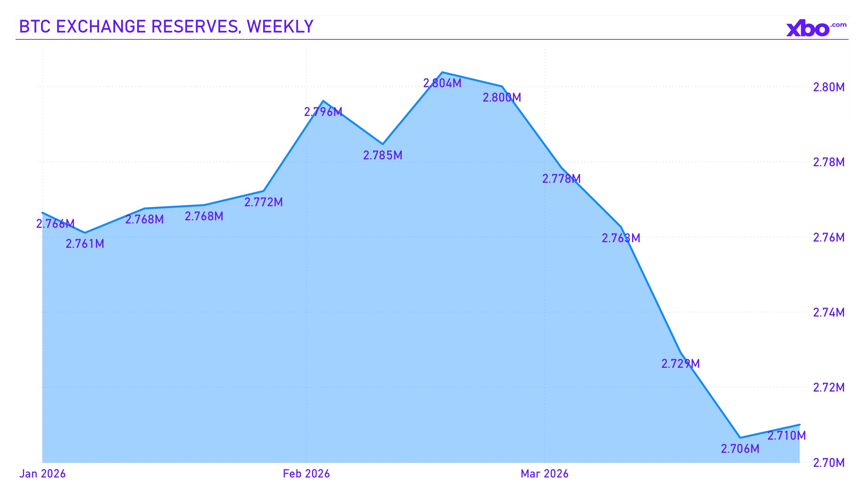 Bitcoin reserves on centralized exchanges dropped to 2.7 million BTC, representing just 13% of total circulating supply. Coins are moving into cold storage, corporate treasuries, and self-custody. This creates structural tension: the supply available for sale is shrinking, while demand, despite slowing, remains supported by ETF inflows (total Q1 net inflows into BTC ETFs amounted to $304 million), corporate purchases, and sovereign reserves.
