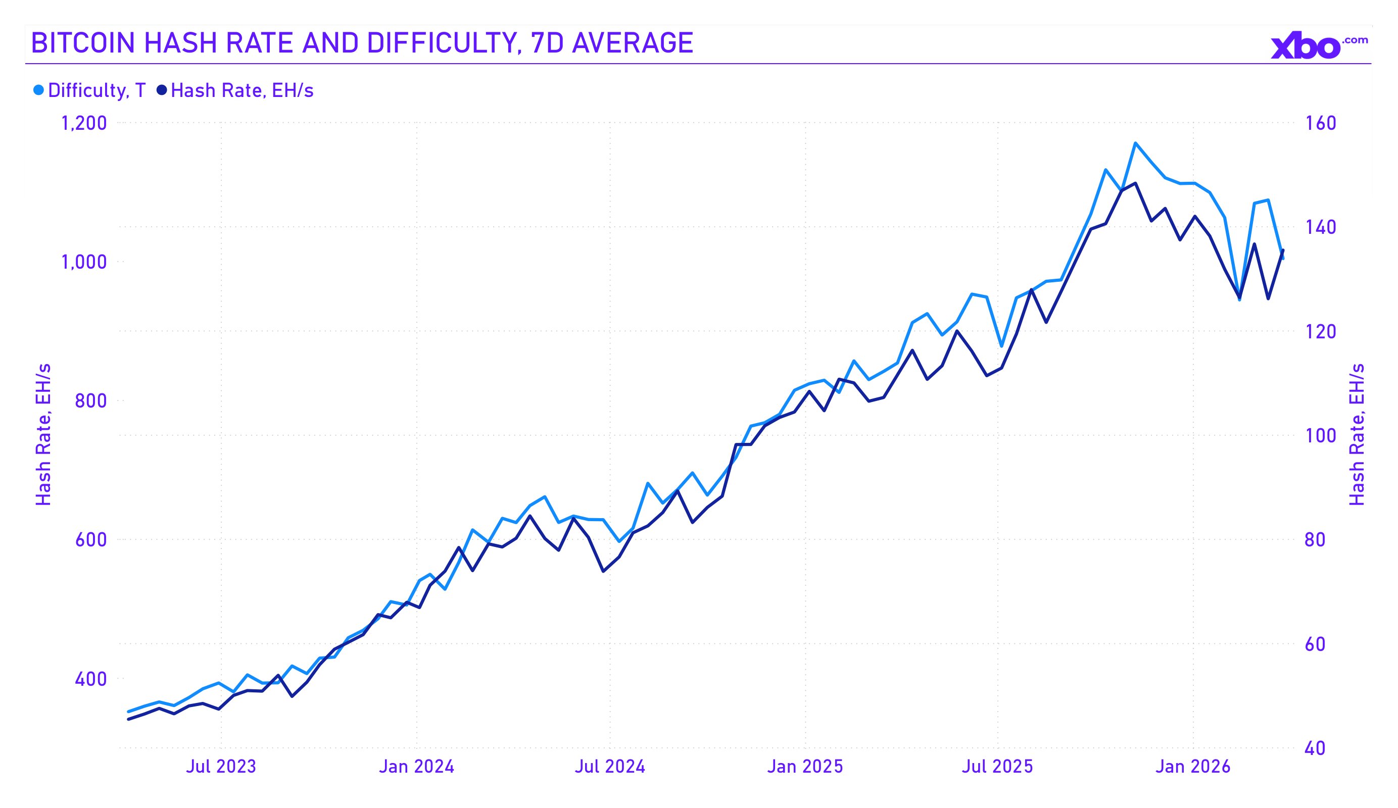 Hash rate has declined since November 2025. This points to miner capitulation: the least efficient operators are shutting down equipment or liquidating treasury reserves. Core Scientific announced the sale of 2,537 BTC in Q1, while Cango Inc. sold 4,451 BTC in a single weekend.