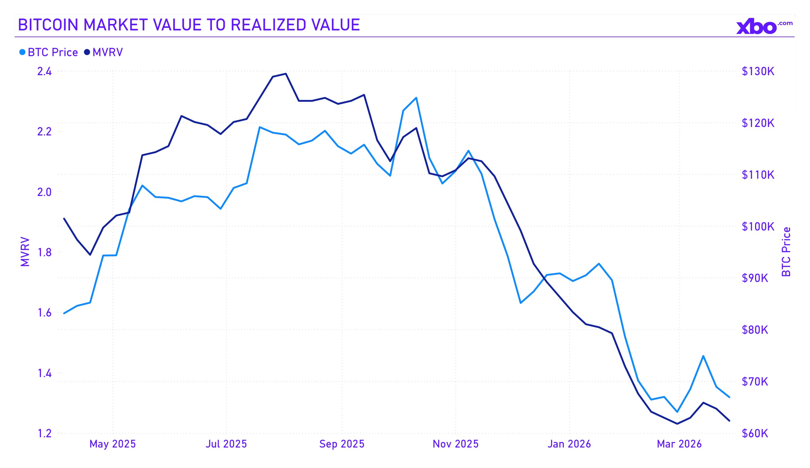 The MVRV minimum for the quarter was recorded at the end of February 2026: 1.23 at a BTC price of $64,000. This is a level close to the zone that Glassnode analysts classify as "anxiety." For comparison, at the absolute minimums of previous cycles, MVRV dropped below 1.0, meaning the average holder was at a loss. The current value of 1.23–1.24 at the end of March suggests that the market has approached the "opportunity" zone but has not yet reached the zone of total capitulation.
