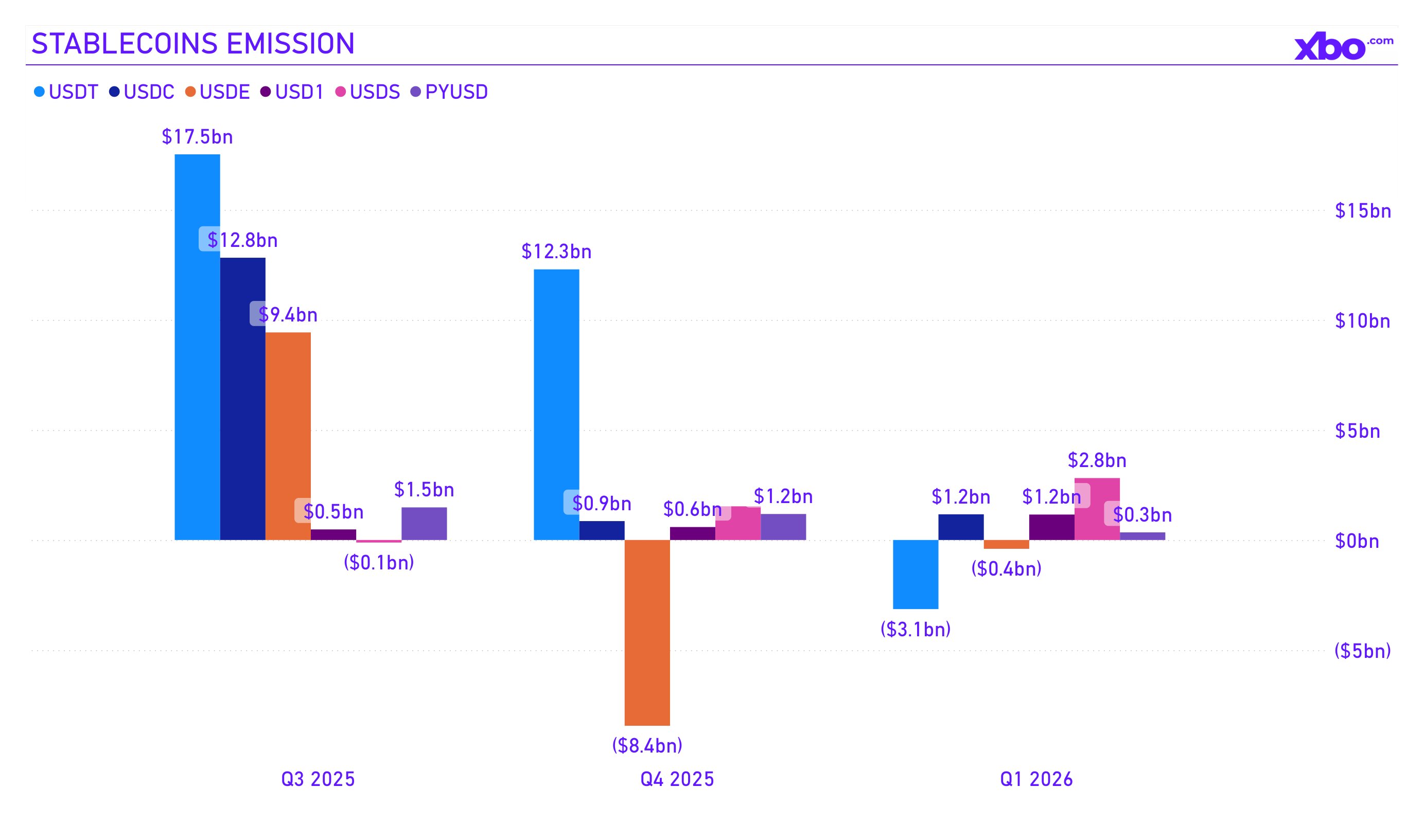 Net stablecoin issuance for the quarter was +$1.38 billion. This result is positive but notably more modest than +$6.4 billion in Q4 2025 or +$41.8 billion at the Q3 2025 peak. Behind this aggregate figure lies a reshuffling of forces among issuers.
